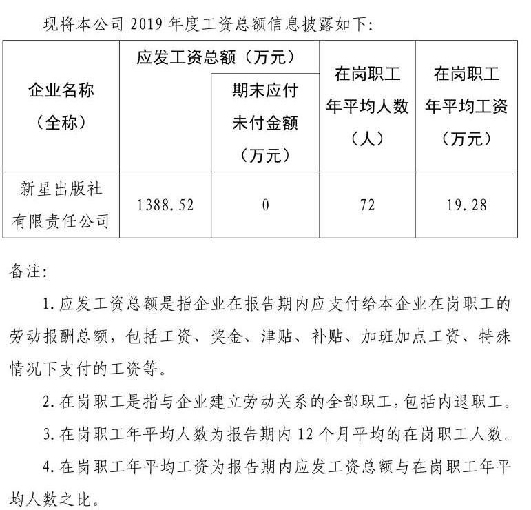 2019年新星出版社有限責(zé)任公司工資總額信息披露